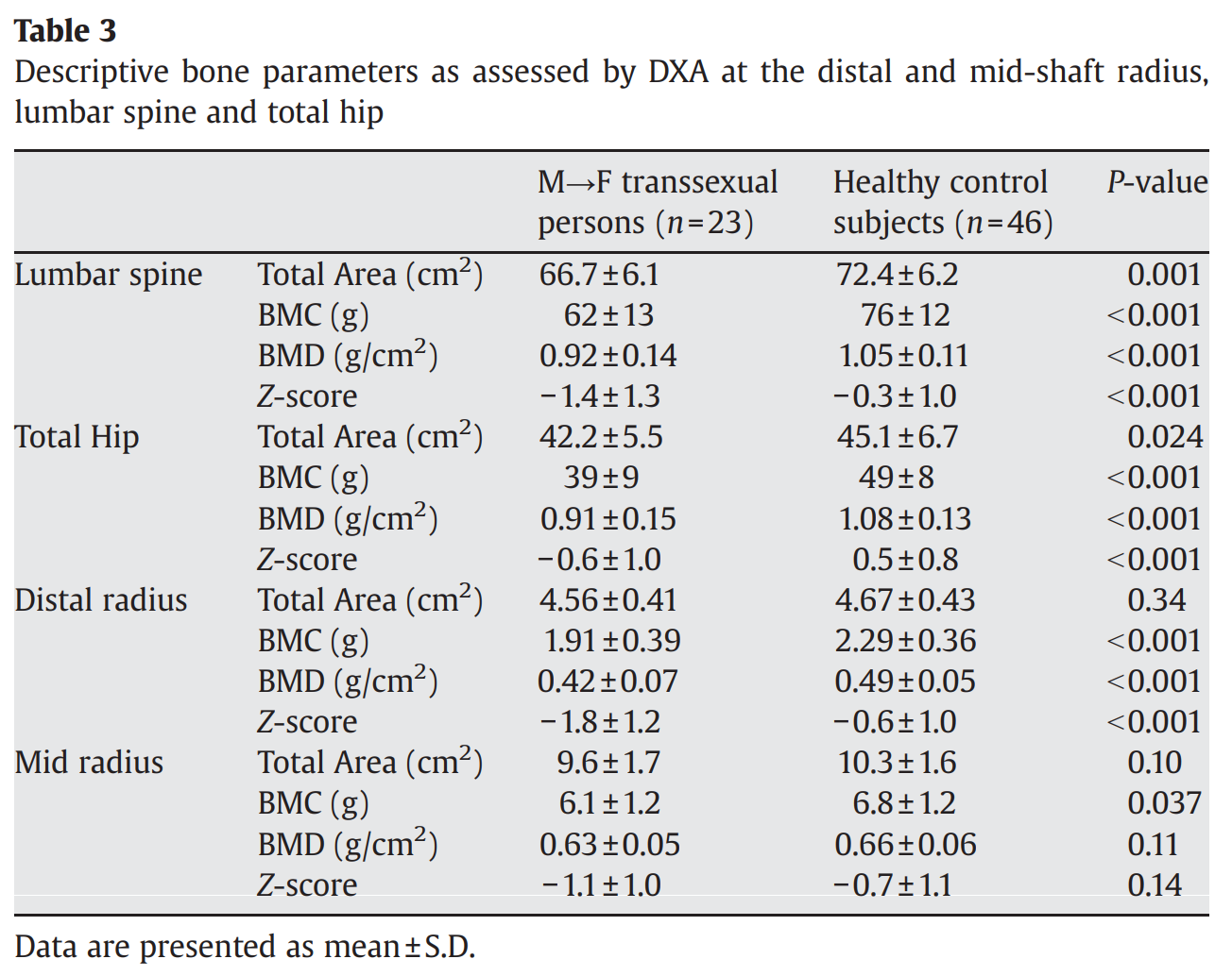 With respect to bone area while there was – somewhat surprisingly – a significant difference between the control men and transfeminine individuals prior to starting GAHT in various bone area measurements and BMD there was no statistically significant change in bone area for hips, radius (lower arm bone), femoral neck (the length between the femoral head which fits into the pelvis and the rest of the femur) or lumbar spine (lower spine bones).