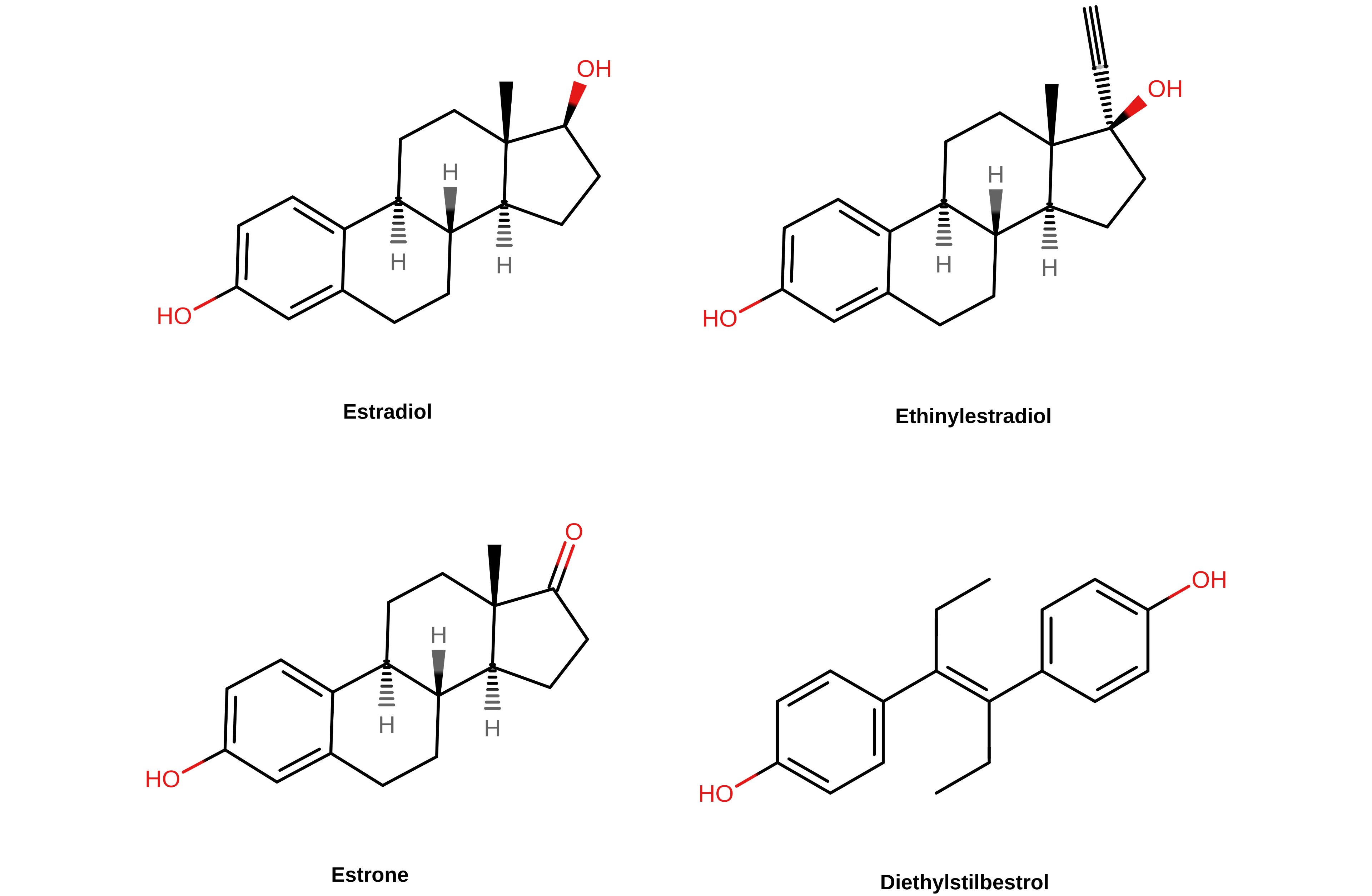 | Figure 2: Chemical structures of selected estrogens. The C17 position in the case of the steroidal estrogens (E2, E1, and EE) is at the top right of the steroid nucleus. |